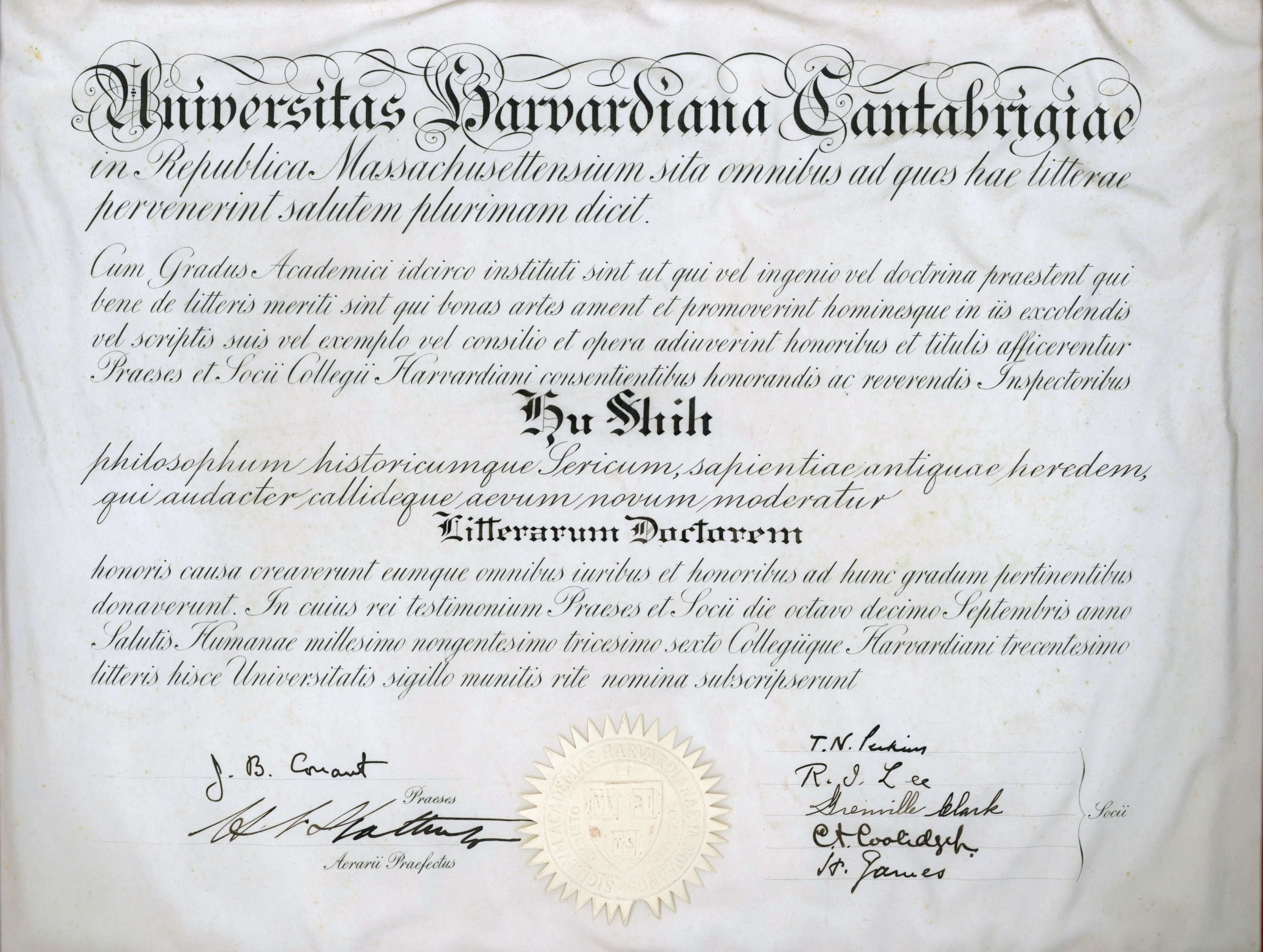 胡适1936年哈佛大学荣誉文学博士证书