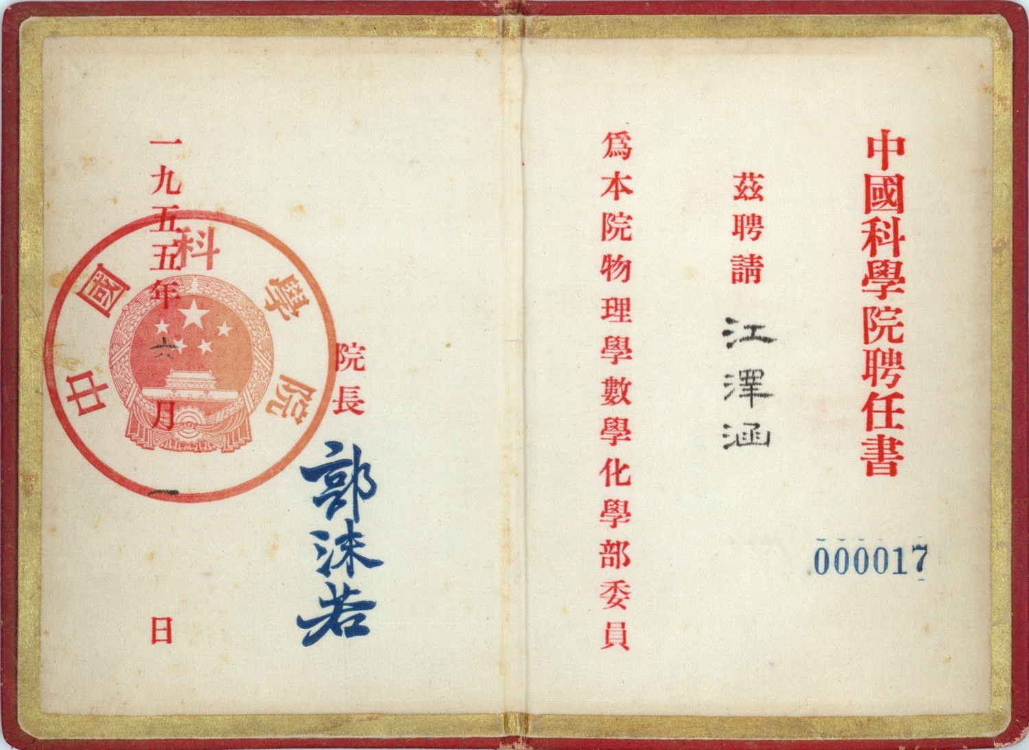 江泽涵1955年中国科学院物理学数学化学部委员聘书