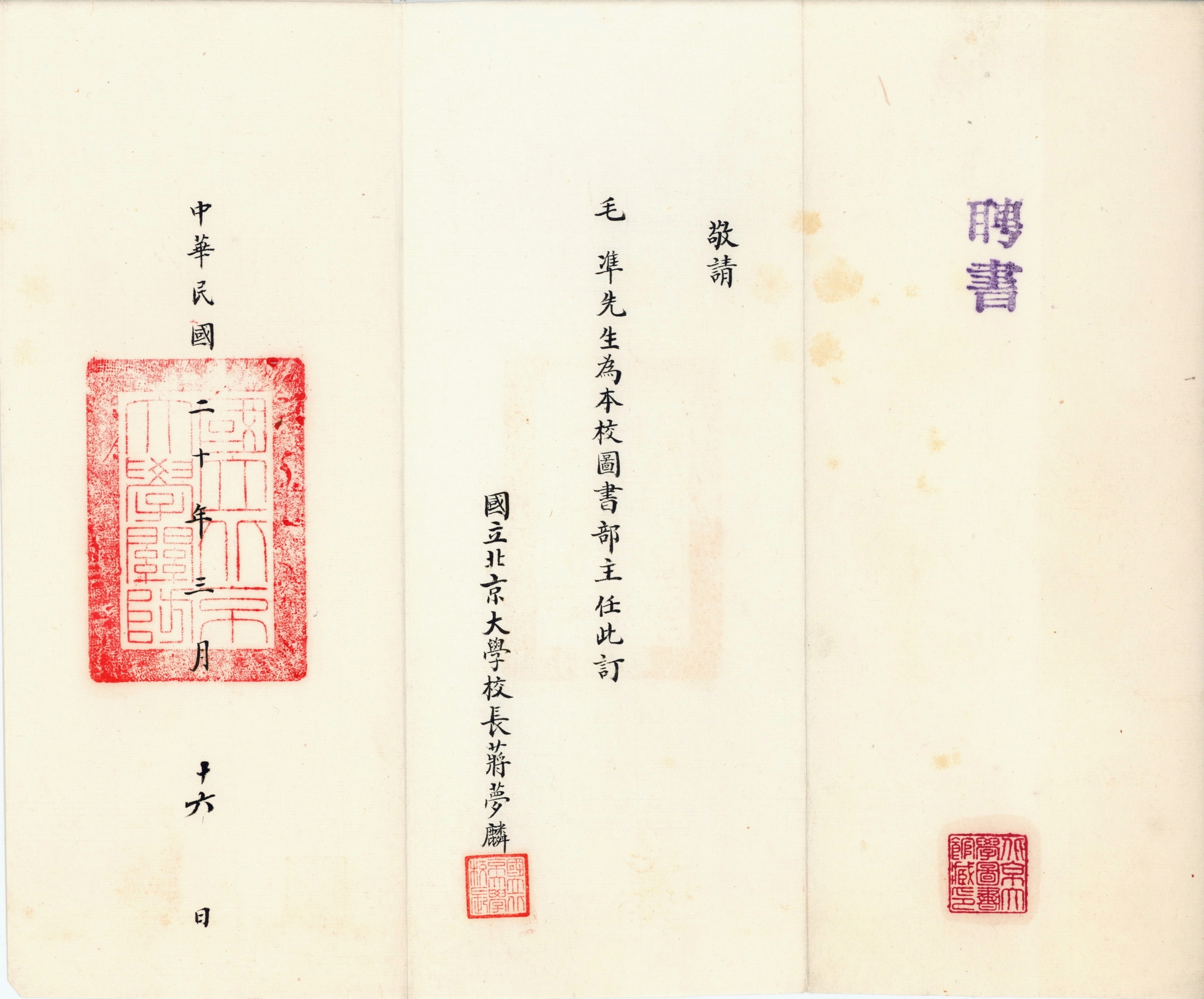 毛准1931年3月北京大学图书馆主任聘书