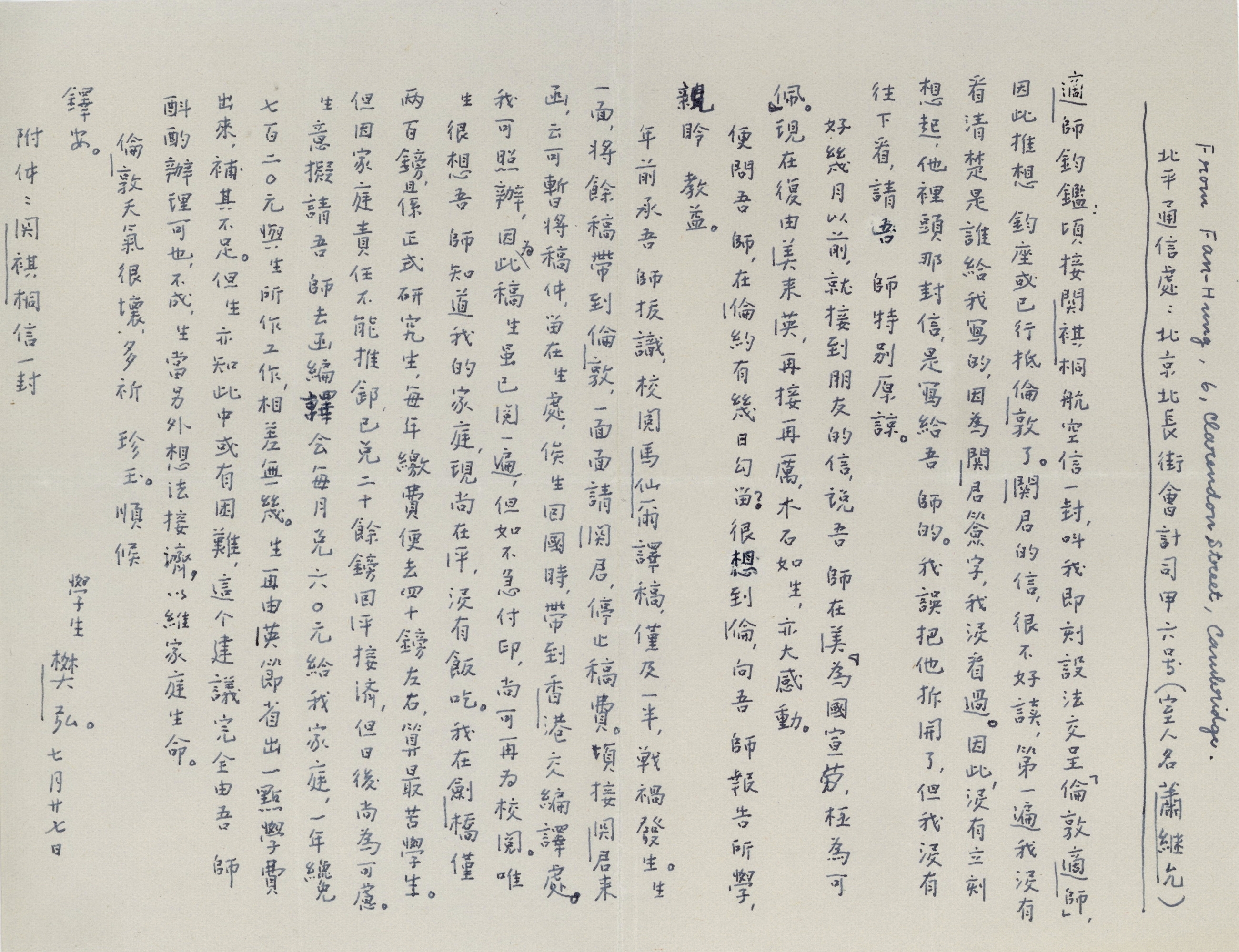 樊弘1938年7月27日致胡适