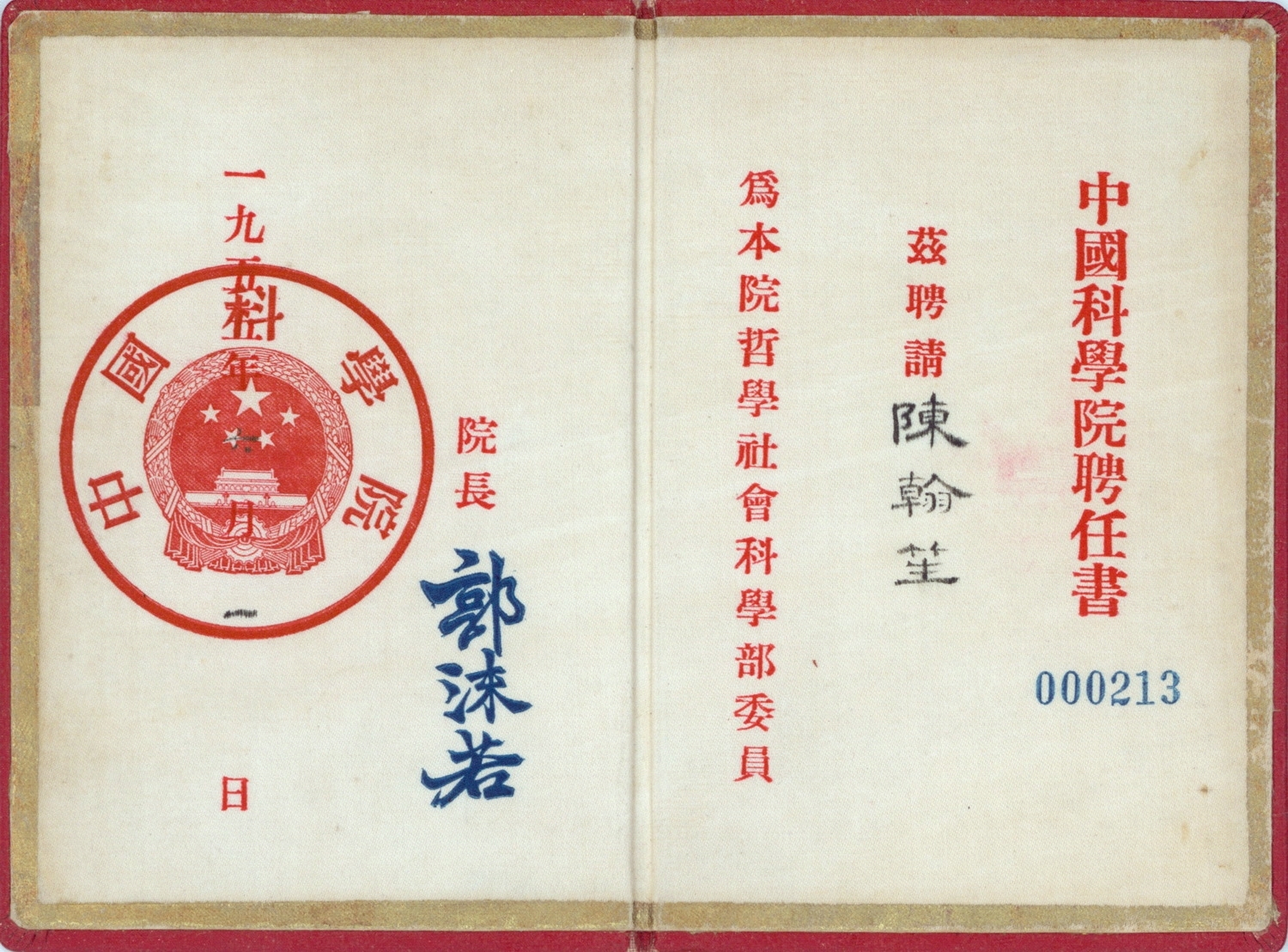 陈翰笙1955年中国科学院哲学社会科学部委员聘书
