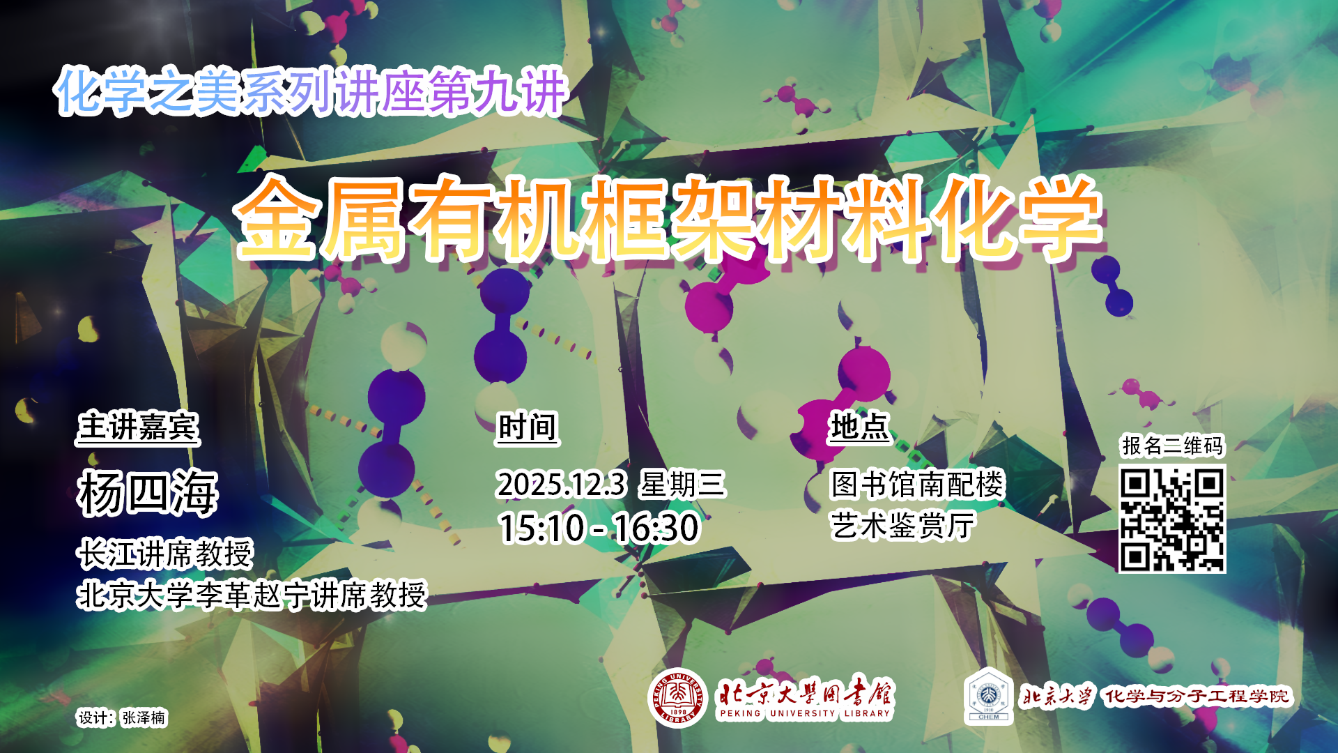 北大图书馆依托北京大学多学科综合性高校优势资源,深挖不同学科的美育内涵,激发学生对各学科的探究兴趣,提升综合素质,面向本校学生开创了“学科之美”讲座品牌。近期,图书馆和化学与分子工程学院合作举办“化学之美”系列讲座,邀请化学学院各研究领域老师带领同学们走近不一样的化学世界,领略化学的惊艳之美。