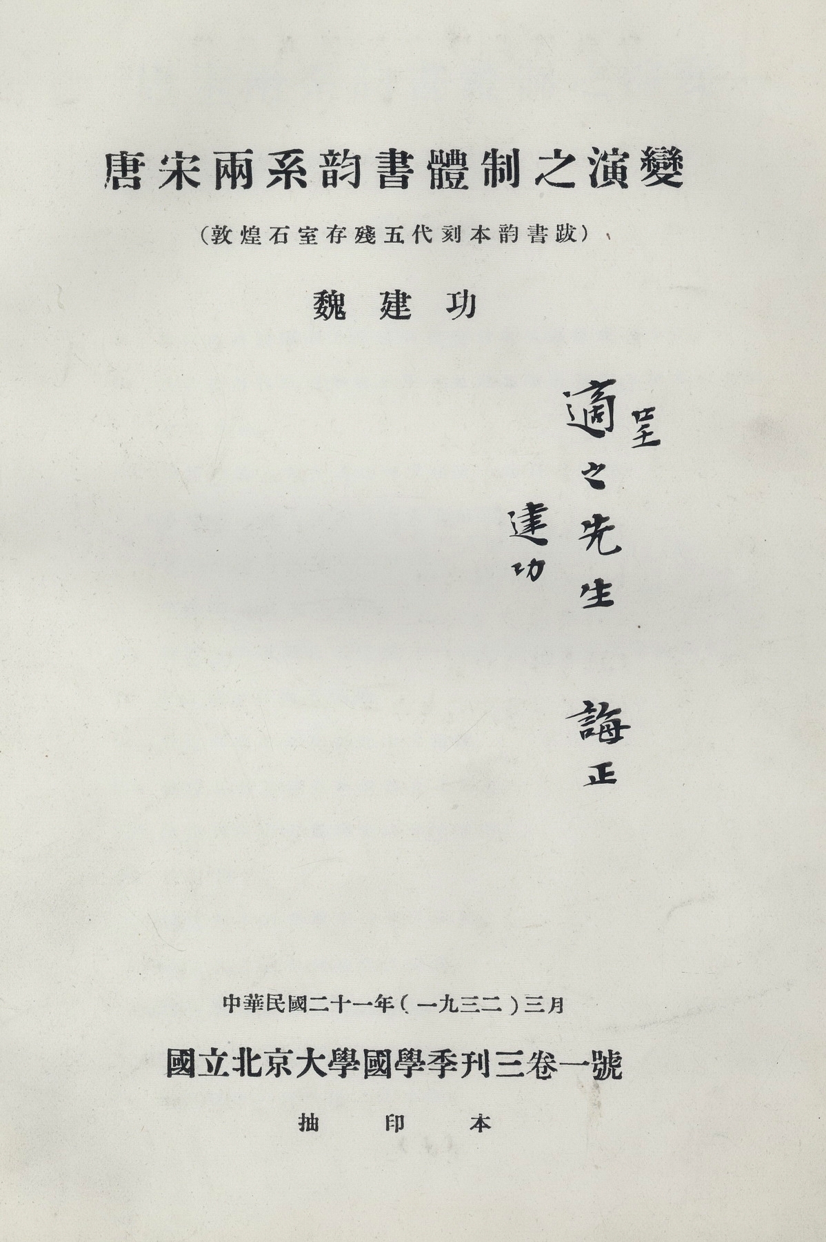 魏建功赠胡适《唐宋两系韵书体制之演变》