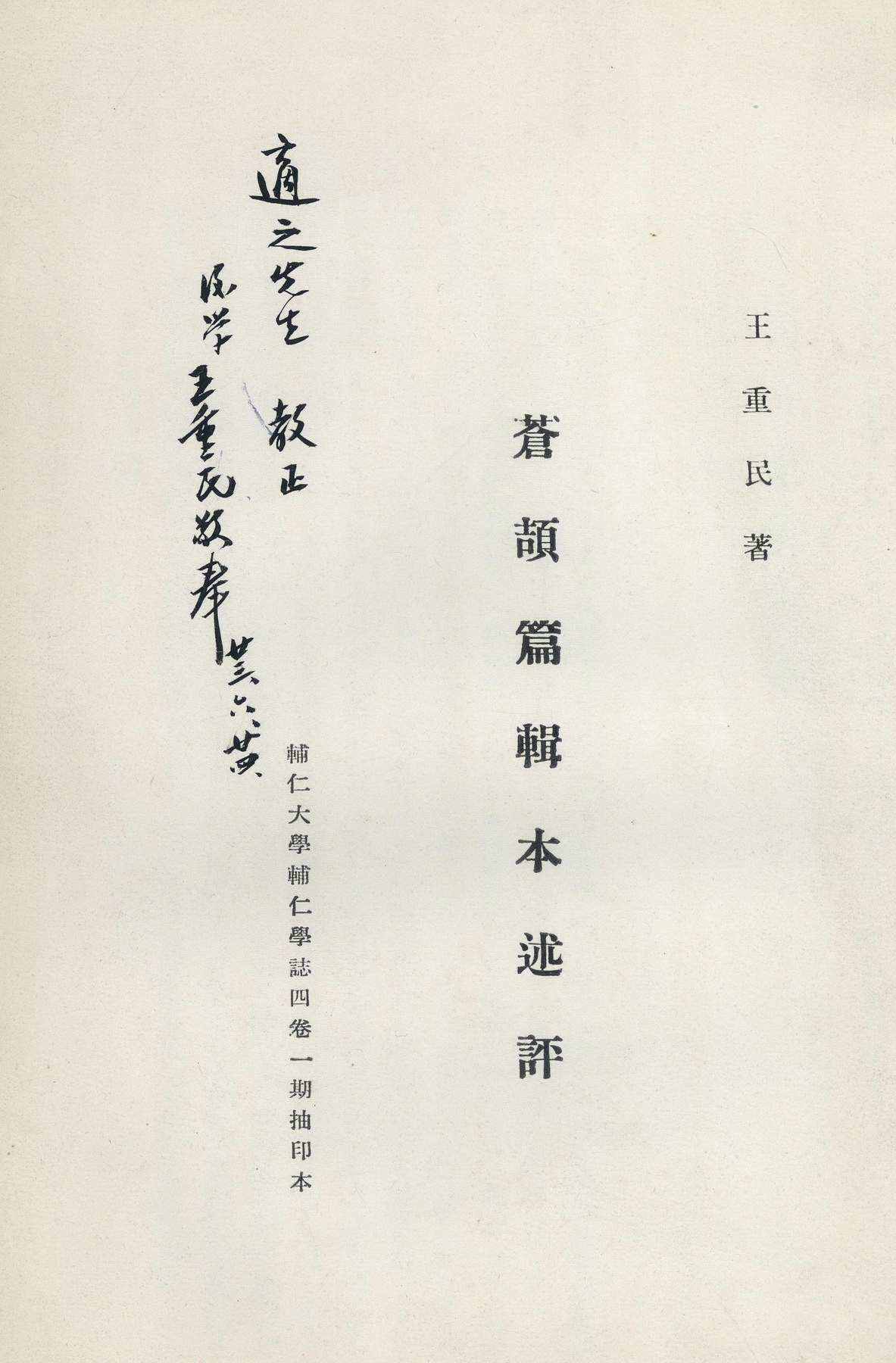 王重民1934年6月24日赠胡适《仓颉篇辑本述评》
