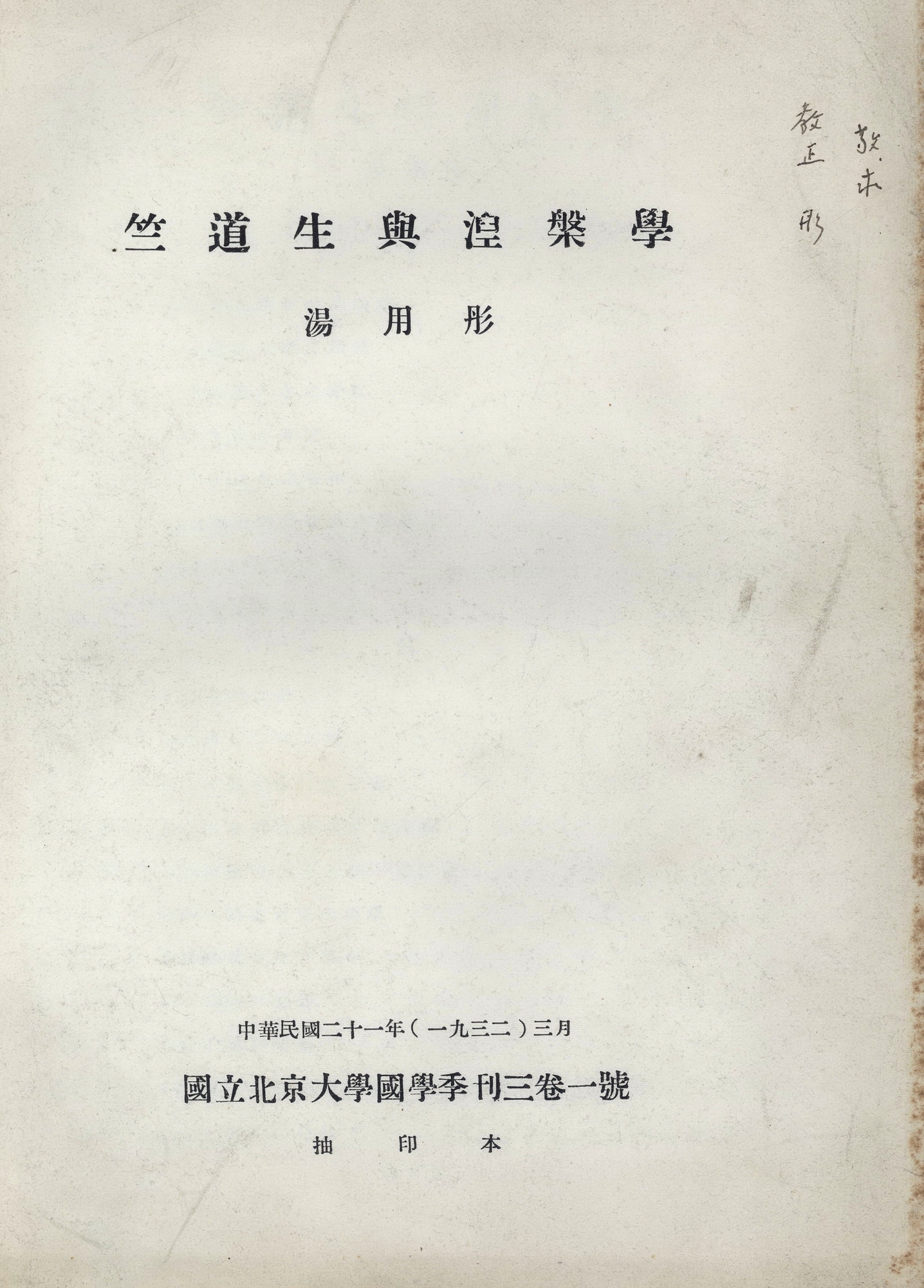 汤用彤赠胡适《竺道生与涅槃学》