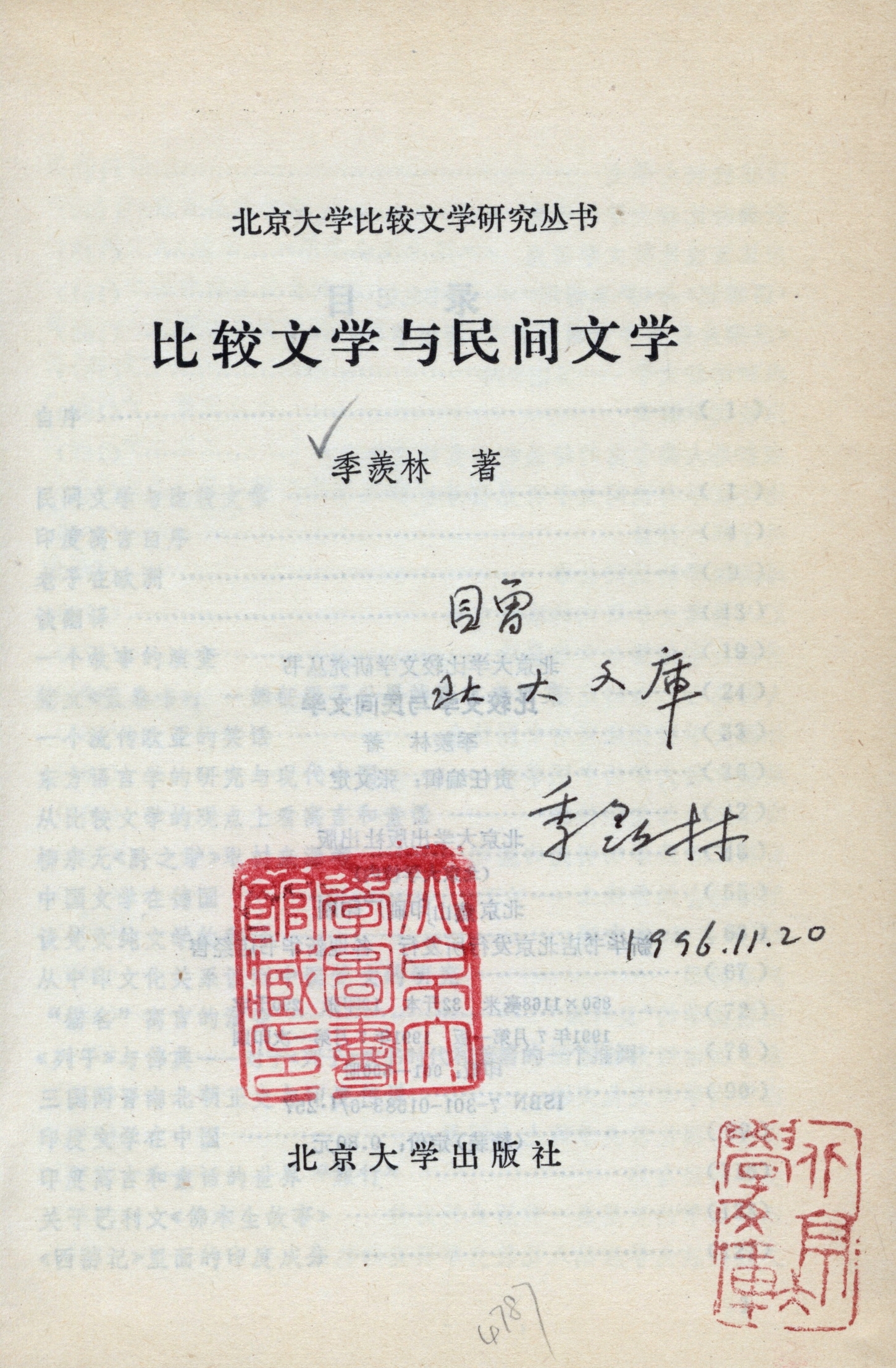 季羡林1996年11月赠北京大学图书馆北大文库《比较文学与民间文学》