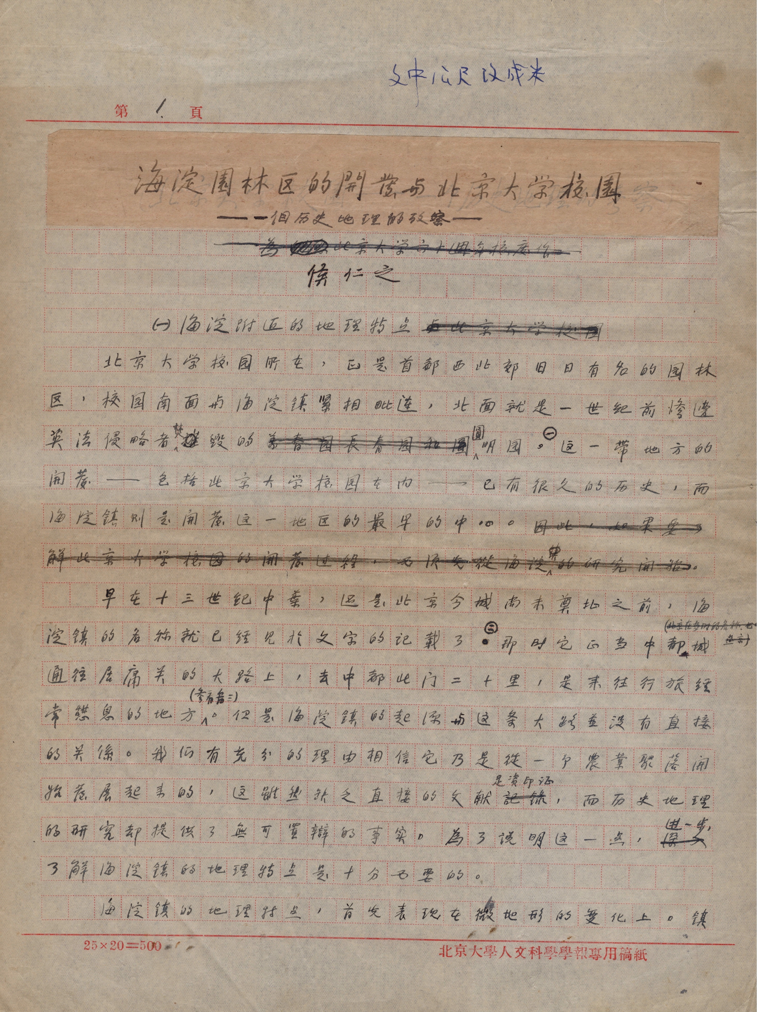 侯仁之《海淀园林区的开发与北京大学校园》手稿