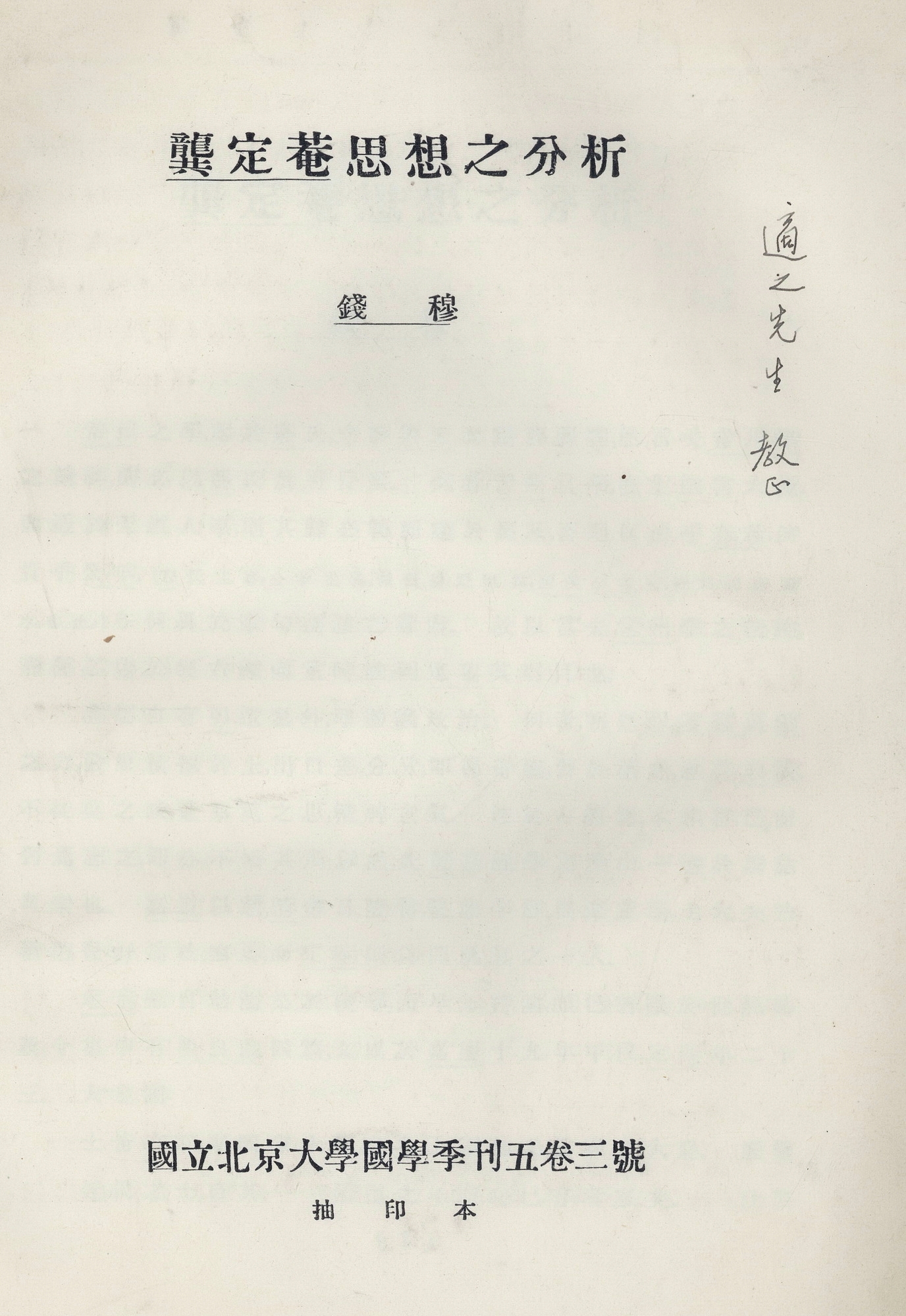 钱穆赠胡适《龚定庵思想之分析》