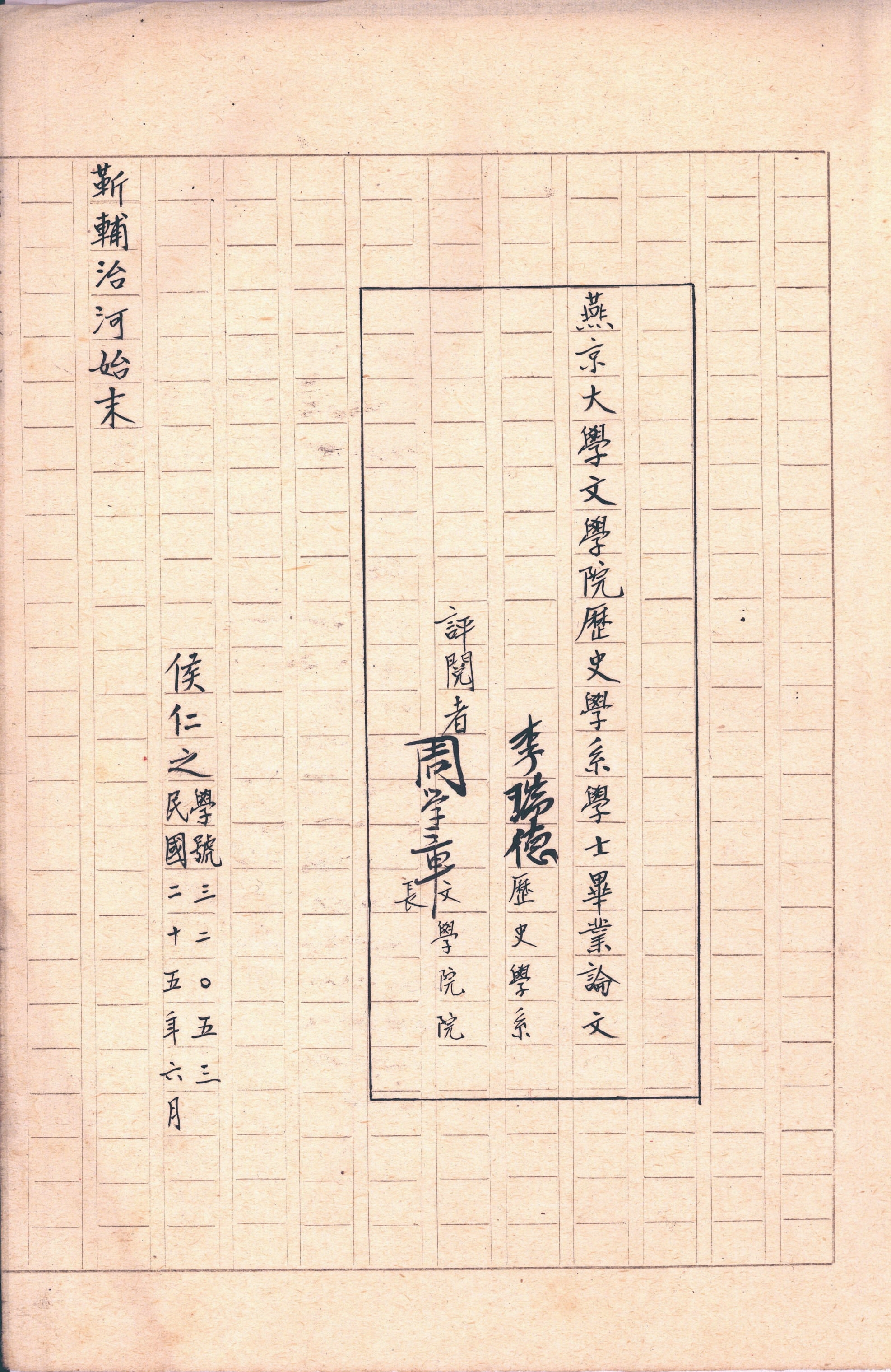侯仁之1936年燕京大学历史学系学士毕业论文《靳辅治河始末》