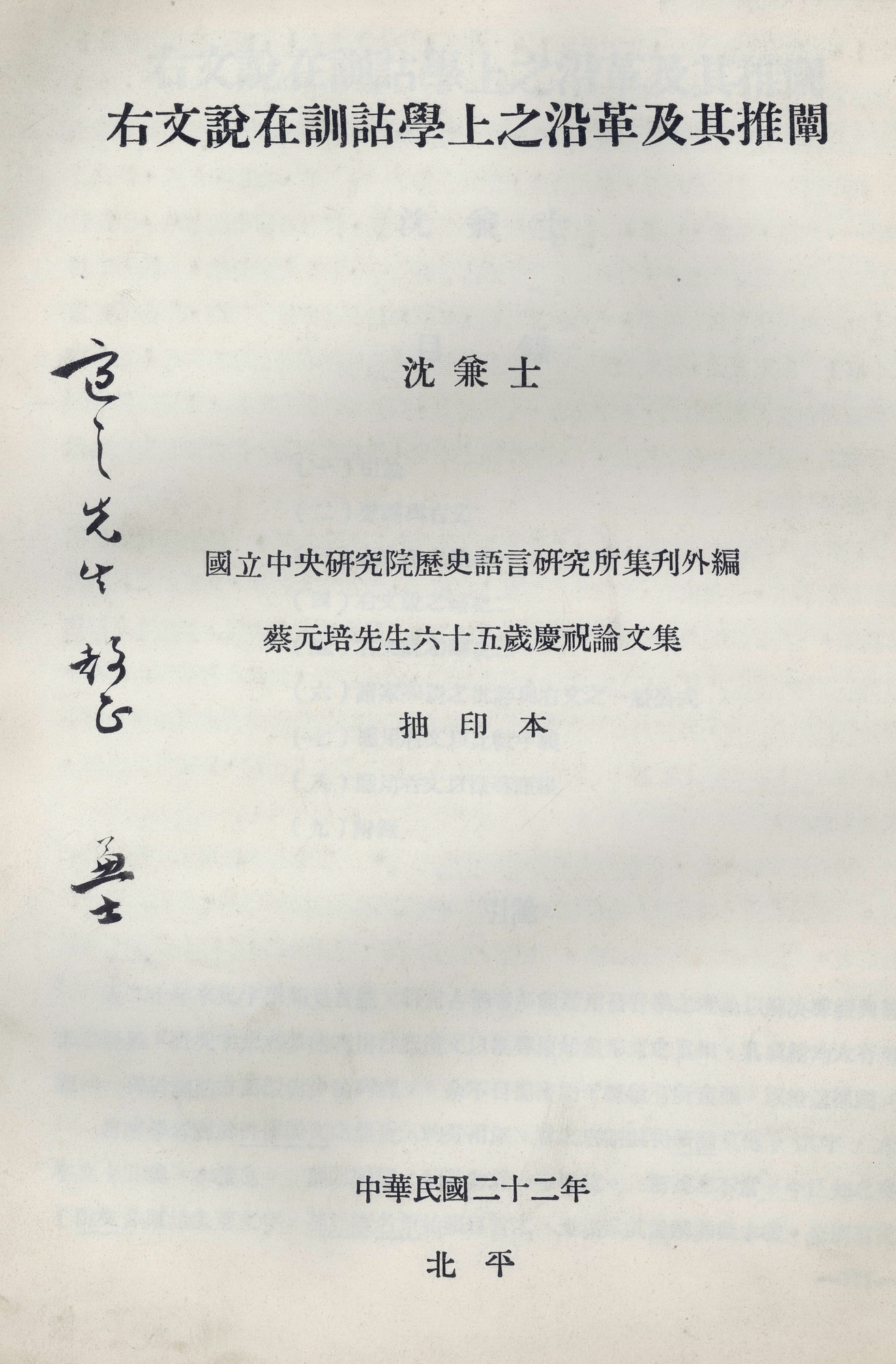 沈兼士赠胡适《右文说在训诂学上之沿革及其推阐》